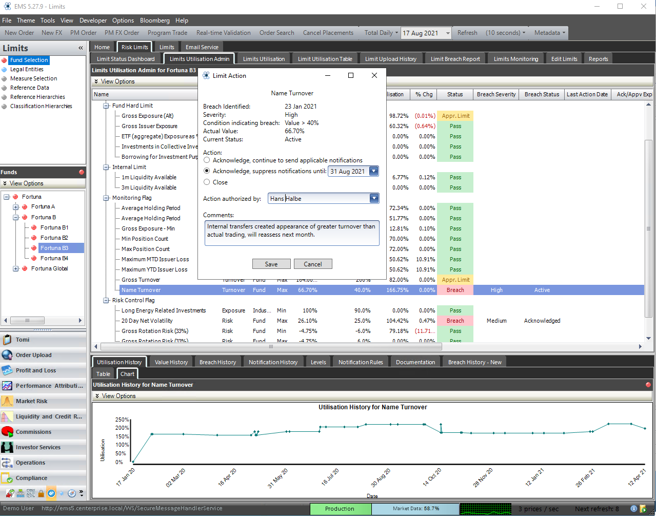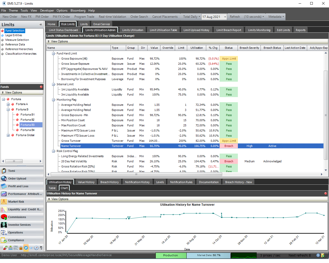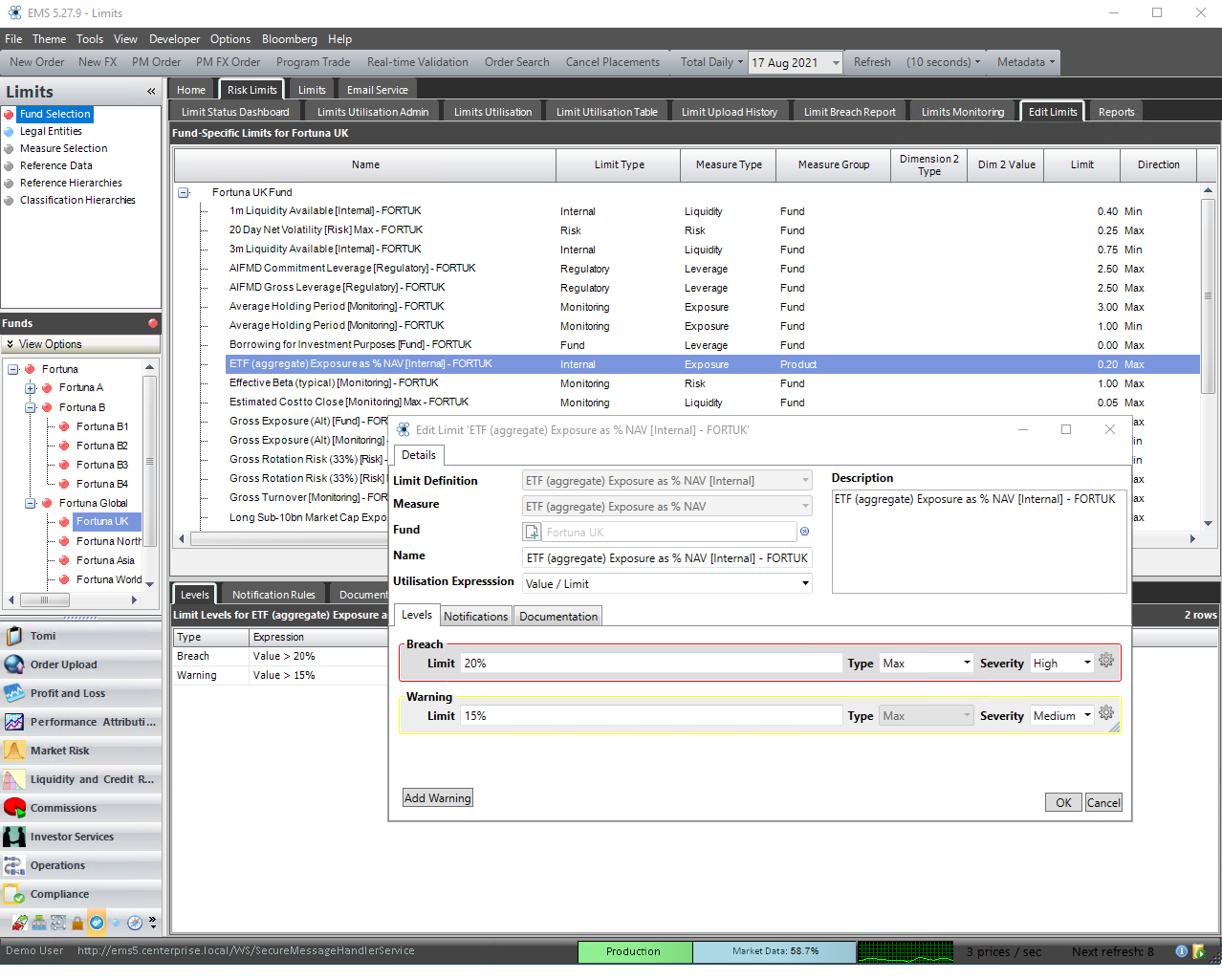 The Centerprise EP Limits Monitoring module allows your risk management team to monitor hard and soft limits imposed by external regulators, fund prospectuses, and internal policies, with automated alerts and a robust daily workflow for responding to warning and breach events.